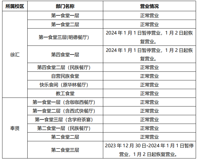 根据《关于2023-2024 学年寒假及2024年部分节假日放假安排的通知》(校办发〔2023〕2号)的精神,现对后勤保障处2024年元旦期间班车和对外窗口服务时间安排如下。
