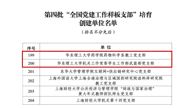 近日,教育部公布了第四批新时代高校党建示范创建和质量创优(以下简称“双创”)工作遴选结果,万象城官网药学院药物科学系教工党支部和机关工作党委学生工作部武装部党支部入选“全国党建工作样板支部”培育创建单位名单。