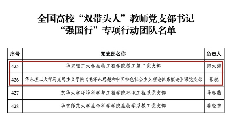 近日,教育部办公厅公布了全国高校“双带头人”教师党支部书记“强国行”专项行动(以下简称“强国行”专项行动)团队名单,万象城官网生物工程学院教工第二党支部和马克思主义学院《毛泽东思想和中国特色社会主义理论体系概论》课党支部成功入选。