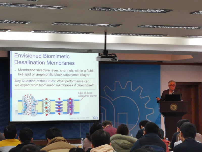 At the invitation of Professor Yang Qiang and Professor Wang Hualin of the Marine Ecology and Advanced Equipment Engineering Center of ECUST, Professor John C. Crittenden, President of Brookbell Institute of Sustainable Development of Georgia Institute of Technology, Academician of American Academy of Engineering, Foreign Academician of Chinese Academy of Engineering, and Professor Menachem Elimelech, Professor of Environmental and Chemical Engineering of Yale University, Academician of American Academy of Engineering, and Foreign Academician of Chinese Academy of Engineering, paid visits to ECUST on Dec. 19th, 2018. The two professors delivered academic reports at the lecture hall of Yifu Building. Professor Yang Qiang presided over the academic report and more than 100 teachers and students attended the meeting and had a heated discussion afterwards.