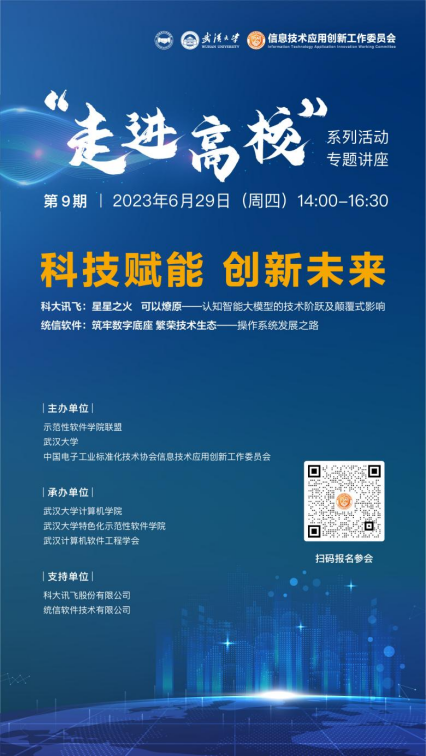 2023年6月29日(星期四),学院举办“信创”技术报告会,来自科大讯飞、统信软件的专家,围绕软硬件自主化,介绍先进思想和技术。报告会中也会介绍企业就业相关信息。欢迎老师、同学参加。有意参加的同学,请扫码报名。