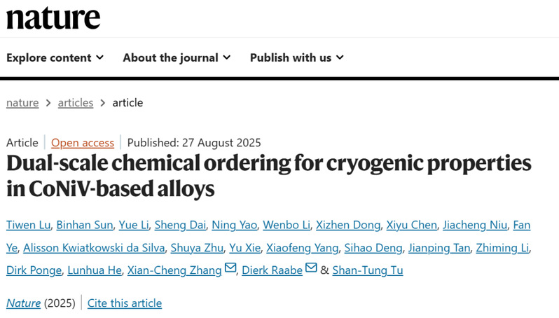 8月28日凌晨,万象城老虎机官方网站机械与动力工程学院张显程教授、涂善东院士团队在Nature(《自然》)发表题为“Dual-scale chemical ordering for cryogenic properties in CoNiV-based alloys”的最新研究成果。